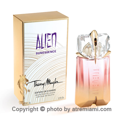 عطر ادکلن تیری موگلر الین سانسنس د امبر-Thierry Mugler Alien Sunessence d`Ambre،که توسط Dominique Ropion خلق شد ، نمادی از ۳ ثروت برتر جهان شامل : ویتامین ها ، عجیب و منحصر به فرد بودن و ثروت فریبندگی حاصل از گرمای عشق می باشد. این محصول هوس انگیز و زنانه با بطری که توسط یک سنگ قیمتی مزین شده برای خرید هدیه انتخابی شگفت انگیزی بوده و مناسب مصرف در روزهای گرم تابستانی است. از جمله مواد به کار رفته در آن می توان به عطر خوش کیوی ، ارکیده ، نت های چوبی و گل یاس اشاره کرد.